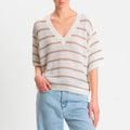 Tensione in-Maglia a righe mezza manica scollo a v coste inglesi - panna/beige