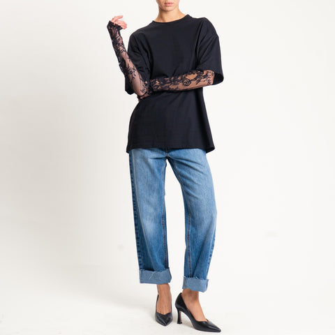 Vicolo- T-shirt manica doppio tessuto in pizzo - nero