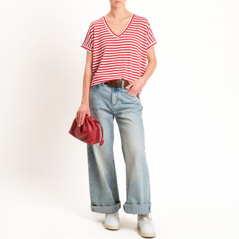 Zeroassoluto-T-shirt a righe scollo a v in jersey di viscosa elasticizzata - rosso/latte