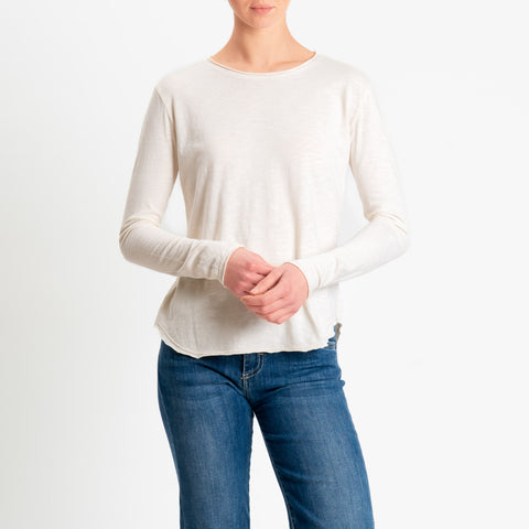 T-shirt a manica lunga realizzata in 100% cotone fiammato, caratterizzata da una texture naturalmente irregolare che dona al capo un aspetto ricercato. Il fit morbido e confortevole è arricchito da bordi a taglio vivo che aggiungono un dettaglio distintivo.