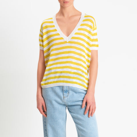 Zeroassoluto-Maglia scollo v a righe garza di viscosa - senape/bianco